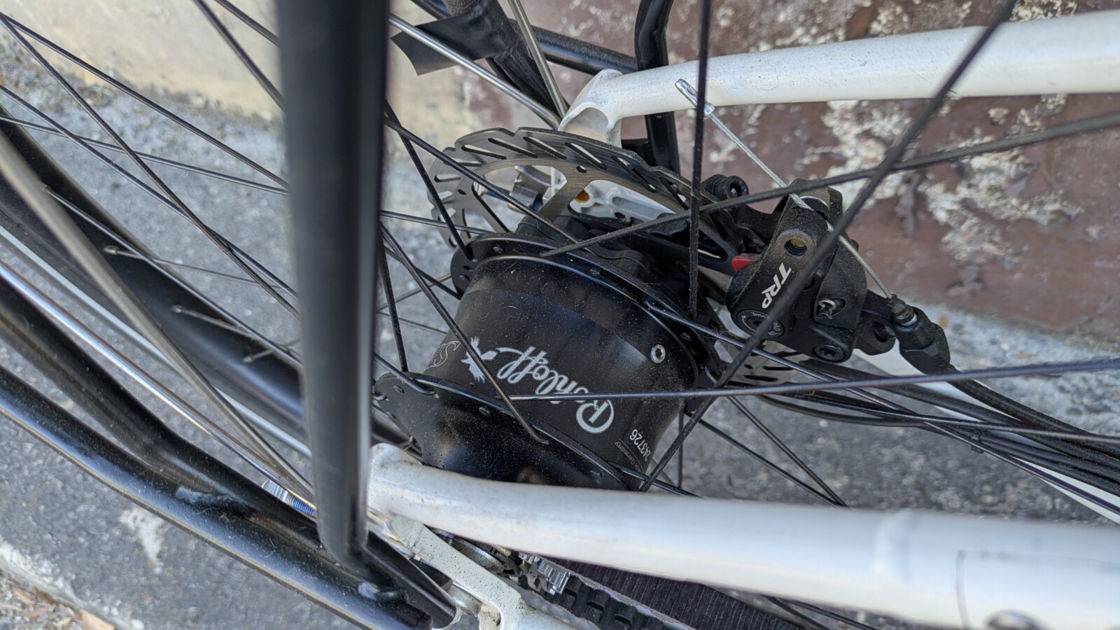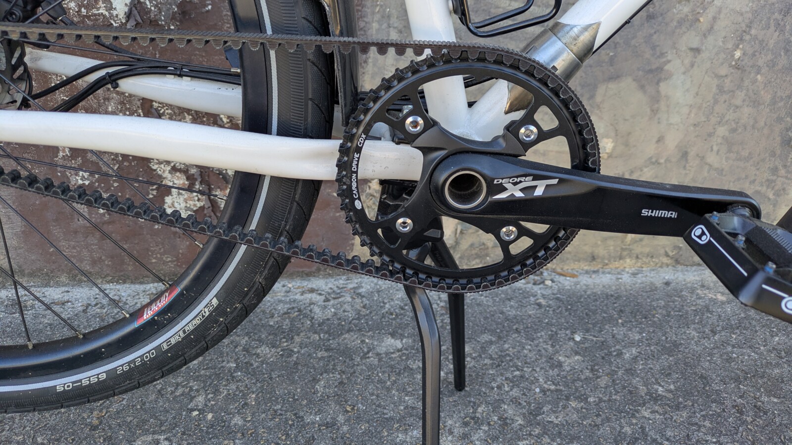 Custom build, frame was sent to a builder in California who cut the frame and added S&S couplers, belt drive, and built custom wheels around the Rohloff and SON dyno hubs. Frame was powder coated to look factory after the work. All components are high end parts.